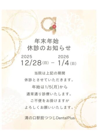 小児歯科、一般歯科、歯科口腔外科、睡眠時無呼吸症候群治療、ホワイトニング、インプラント専門医による治療を行う高津区の歯医者【溝の口駅前つつじデンタルプラス】です下記日程にて、診療を休診とさせていただきます。2025年12月27日(土)17:00まで診...